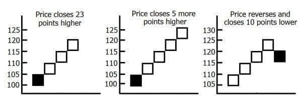 Renko bricks are drawn at 45 degree angles from each other and are based on the closing price per period.? If you have a brick setting of 5 dollars and the stock price closes 23 dollars higher, five bricks would be added to the chart.? Another brick would only be added if you were to have a new close another two dollars higher.? For there to be a brick created in the opposite direction, you would need prices to reverse and close at least two times the size of the brick.? If price does not do this, then any correction will be ignored by the chart.?