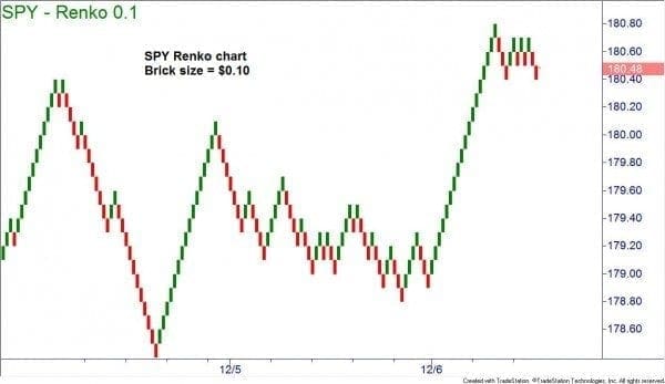 Renko (derived from the Japanese word ?renga? or brick), is based on movements in price and not time.? There must be a particular size of movement or the chart ignores it.? Since time is not a factor for Renko charts, it may be a technique that should be used for swing or position traders rather than for intraday traders.?