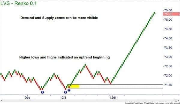 Trends can be seen much easier when using these types of charts.? Supply and demand zones also seem to be more visible.? When trading, always trade in the direction of the dominant trend.? You can stay in the trade until your next target is reached or when you have a sign of reversal which would be a brick in the opposite direction.?