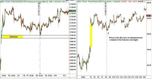 As we can see, the QQQ ( Nasdaq 100 tracker) traded slightly inside the gap, and immediately turned higher.? Prices turned because there was a demand level that was formed in the Nasdaq futures market during the European session.? The ?trader that was not watching the futures market probably anticipated the gap to be filled, and missed the trade. While the more astute trader probably made the trade because of the demand level showing in the Nasdaq futures contract.