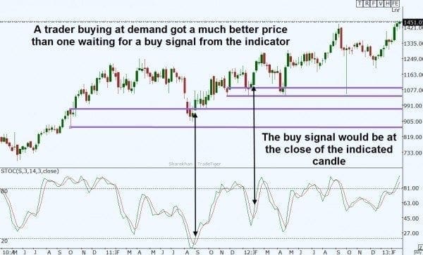 A trader buying into the trend at a demand zone has a huge advantage over the one who is waiting for the stochastic to signal a buy.? The crossing of the %k above the %d to signal a buy would not happen until the close of the candle leaving the demand zone.? It does give you confirmation but also a higher entry price.
