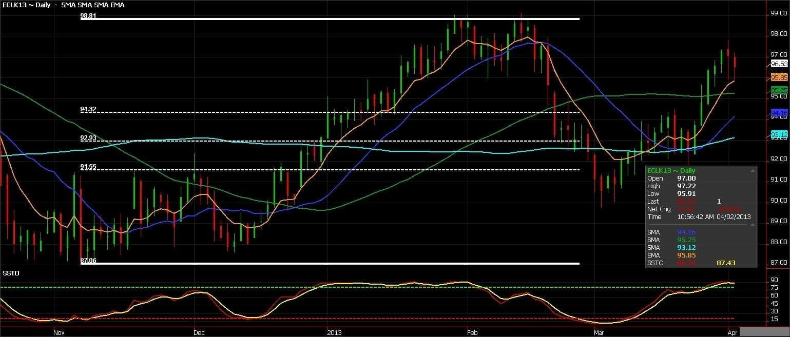 As far as winning streaks go, crude has closed higher 14 of the last 20 trading days (after a swing low on March 4th). What?s more, we haven?t seen two consecutive ?red? sessions since that low was established a month ago. This streak will be broken if today?s close is below $97.? In my eyes, we?ll have confirmation of an interim top on a settlement under the 8-day MA (orange line). I do not see a fresh 2013 low on the horizon, but I do think the market can depreciate $3 to$5, giving us plenty of room for a bearish trade.