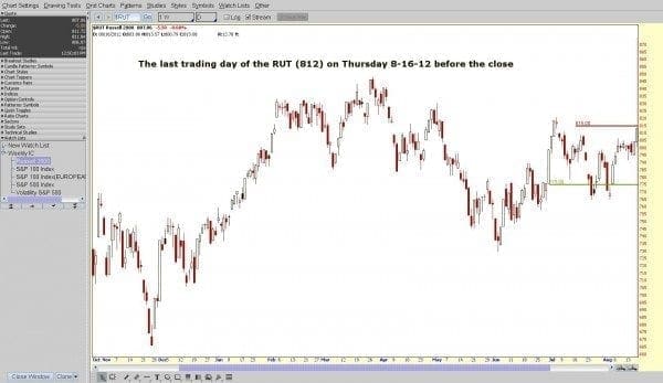 An additional point that ought to be emphasized about the RUT is that its last trading day is Thursday and the actual settlement is at Friday?s open.? Bottom line was that this trade worked out well.? RUT stayed contained in between the two sold strike prices, the two lines on the chart. However, something quite interesting took place on the last trading day of the RUT. Figure 2 shows that the price had rallied all the way up to above 812.