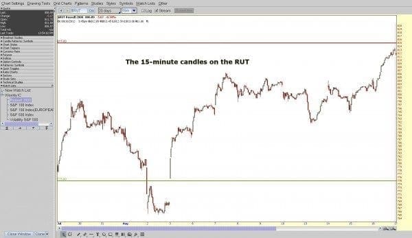 The last chart shows the 15 minute candles and how the RUT failed to rally above 815. On Friday?s open, the RUT settled at $811.65 and not only did the 10 sold Iron Condors work out, but also the single contract Bear Call spread did too. Why was a single contract Bear Call spread selected? The reason is that even if wrong, the Bear Call loss from a single spread? would not wipe out the gain of ten ICs. There was the slight possibility of having both trades turn into losers. Yes, but that is the risk each individual trader must decide upon making prior to placing a second trade on. Be accountable for your own mouse clicking.
