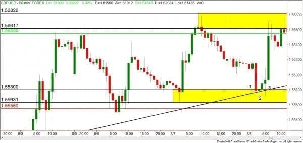So, as we are considering ?dipping our toe in the water? on our trades, testing our level before we put a large position on, what else should we consider? If you answered ?risk management,? congratulations!? Let?s say you have a $10,000 trading account, and on this trade you are willing to risk 2% of your account. Because you aren?t sure exactly at what prices all three entries will be, I?ll use the top of my zone as my average cost of my trade. In this example, my entry will be calculated as 1.5580, with my stop loss for all three entries below the zone at 1.5555. The profit target will be set at 1.5655. With a 25 pip stop and a 75 pip target, my reward to risk ratio is 3:1. Two percent of my account is $200, dividing that figure by the amount of my stop, I can do a total of 8 mini lots maximum.