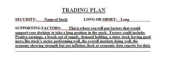 By completing this trade plan, you accomplish several things. You have accountability if you violate the plan and can build discipline. But you also build confidence when you follow your plan and you either make money or lose very little when things don?t work out as you had planned. By preparing the trade plan, you prepare for surprises and will not be shocked into large losses when the market makes a volatile turn.