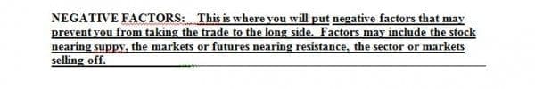 Now the hard part begins. The trader needs to start listing the negative factors that may work against the trade. This is where you have to find the dangers that could increase your risk of losing. We don?t want to think about being wrong and typically have a mental block that prevents us from seeing the danger or causes us to rationalize it. Look objectively at the markets and decide if there are dangers. List them to remind you to be aware and prepared for them!