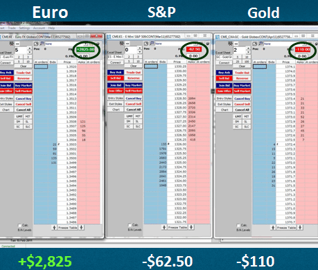 The trades were in the Euro, S&P, and Gold Futures. As you can see above, two of the trades were losers and one was profitable. As you can also see above, the net result of all three trades was a profit of $2,652.50. Notice the losses are much smaller than the gain. The losses should be NO big deal and small. They should represent a small percentage of your account. Your position size should be such that you are not risking more that what you determine to be a truly acceptable loss. You should make sure this number which is really your ultimate risk is a number you are very comfortable with. With the numbers above, I can be wrong and lose money on two out of every three trades for the rest of my life and do very well.