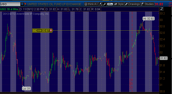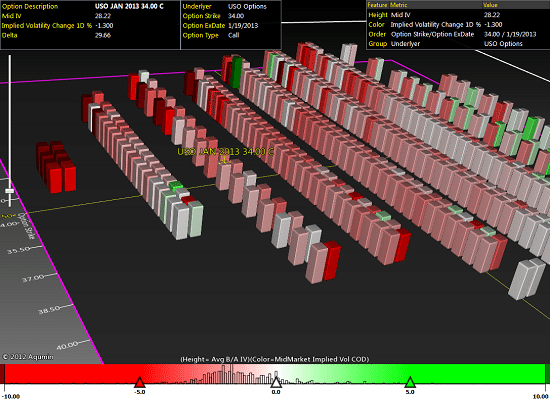 Ultimately I like to see what paper is paying for options and after today the answer is not much.? The view for the OptionVision screen gives a snap of implied volatility across the USO.? The red buildings are just the strikes of the each series with declining implied volatility (calls left and puts right).? Notice the near total annihilation of implied volatility expiring this week which is the term on the far left.? If paper cared about the mix up in Gaza those strikes would be dark green.? I expect oil to settle back to some near term lows but there could be a bump or two in the process.