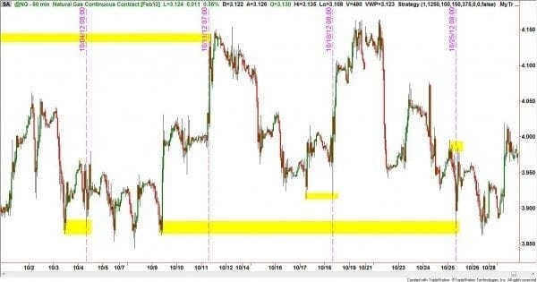 So now that we have the specifications for this contract, let?s review what happens on Thursdays.? This is the day that the U.S Energy Information Administration (EIA) releases the weekly Natural Gas Storage Report which is essentially an inventory report.? As you might have guessed by now, immediately after this information is disseminated, price in the natural gas contract can move dramatically. Quite candidly, we don?t care about the numbers or what they mean to industry insiders. We as traders are mainly interested in the short -term movement caused by this report. ?As we can see from the chart below, in the month of October, on every Thursday at 10:30 EST ? which are indicated by the vertical line?price spiked into quality supply or demand areas highlighted in yellow, which for the well- prepared trader meant good trading possibilities.