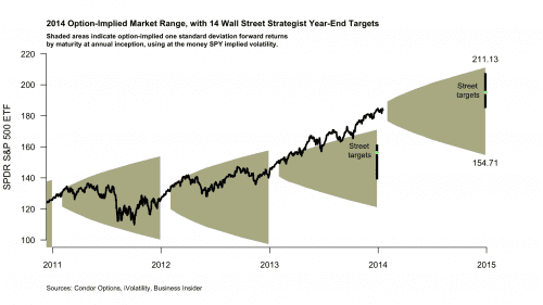 Option implied volatility interpolated for a hypothetical year-end expiration is looking for a one standard deviation move up or down of 15%. That?s actually a slightly narrower range than the same estimate at the beginning of 2013 (+/- 17%) and for those of the two years before that (24%, 21%). This all stands to reason, since what makes for broader range estimates is just greater implied volatility, and for equities implied volatility is greater when investors are thinking more about downside risks. It also follows that we can expect to see year-end ranges continue to narrow as long as the market ramps.
