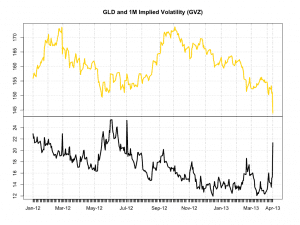 Fig 1. GLD and GVZ, 2012-2013. Source: CBOE, Condor Options