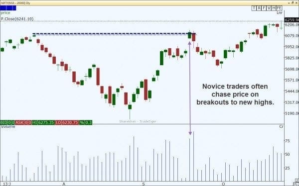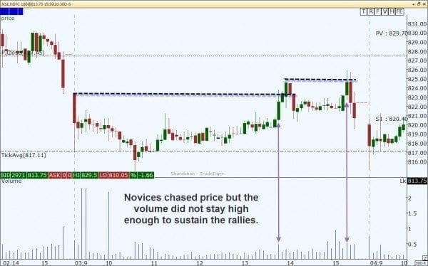 Notice how the volume spikes just after the breakout of the new highs on the Nifty.? This is caused from the amateurs jumping?into the markets?according to?their breakout strategy.? This sudden influx of buying pressure dies off quickly without institutional support.? The amateurs are left holding the bag as price drops fast and either stops them out or increases their pain.