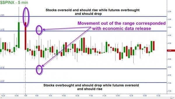 You can see that early in the morning at the equity market open, the premium was too high.? This caused a selloff in the equity markets until the premium was near the -4.94 target.? Later in the day the premium moved again on the release of the Consumer Confidence number.? This gave a knowledgeable trader several opportunities.