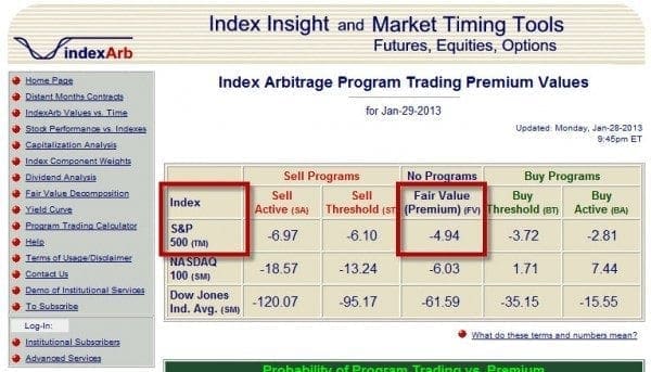 As you can see from the fair value, the S&P Futures should be trading 4.94 points below the S&P 500 Index for the entire day.? The buy and sell thresholds tell the program traders when the two are mispriced and ready for an arbitrage opportunity.? Should the difference between the two become less than 3.72, some of the program traders will buy the undervalued stocks in the S&P 500 and sell the S&P futures to bring the two back in line.? If a larger move on the futures pushes the distance between them and the index to less than 2.81, then all of the programs traders should act and a sharp movement in the markets would result.