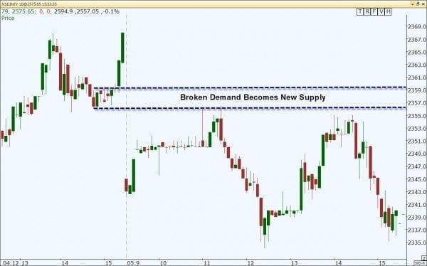 When we buy in a demand zone, we immediately place our stop below that level.? We do this because if we are wrong, we want to exit as soon as possible to minimize the resulting loss.? When demand zones are broken, they reverse roles and act as supply for a couple of reasons.? First, there are many sell stops that will be triggered immediately when prices break that level.? Price breaking a demand zone shows that the buying pressure in the level was not very strong and sellers overwhelmed the buyers.? Traders who entered longs should look to sell with a stop immediately if the level is broken.