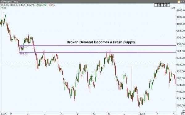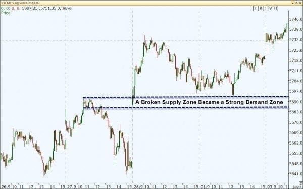 The same phenomenon occurs when there is a break of a supply zone.? That former supply reverses roles and becomes a demand zone when it too is broken.? This also occurs as shorts are stopped out for small or no losses.? If we see traders making the mistake of shorting at a weak supply that is later broken, then it will become a strong buying opportunity for us when that zone is tested as a demand level in the future.