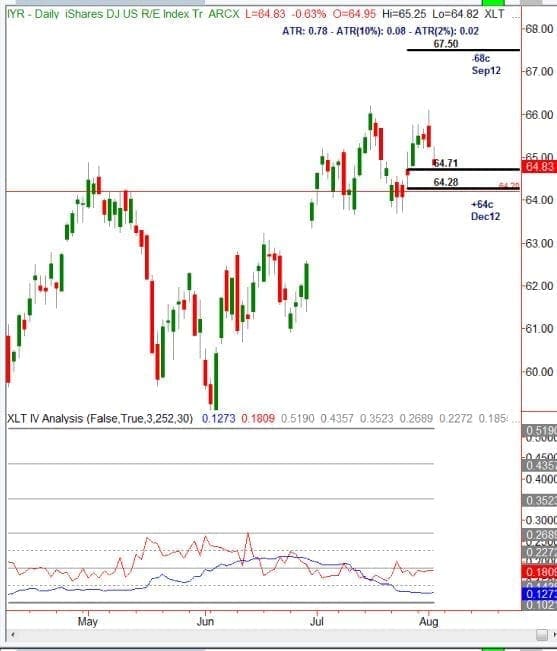 Here?s the background. As of August 2, 2012, the real estate ETF called IYR was in a solid demand zone, so price outlook was bullish. Implied volatility was very low. Here is the chart, as it appeared in our Pro Pick for August 2: