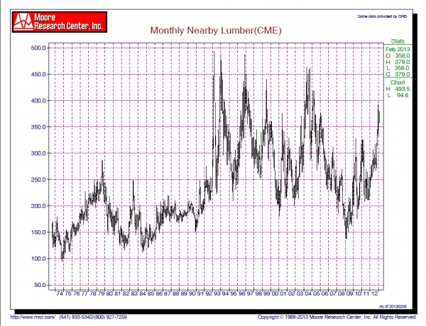 Looking at Figure 1 we can see a long term chart of Lumber going back to 1973.? These charts are compliments of Moore Research Center Inc.? They are provided for free on their website at www.mrci.com