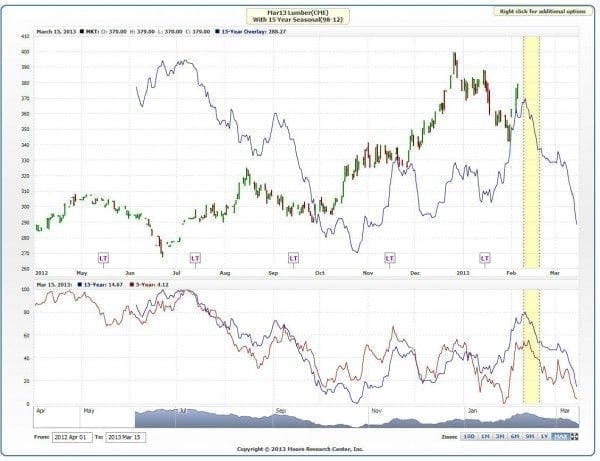 Another event which is coming into play is Seasonality.? Moore Research Center (MRCI) has done research on the Lumber market going back 15 years.? They have found that the Lumber market has closed lower on February 19th than on February 9th 13 of the last 15 years.? Typically the Lumber market makes its high prices between February and April each year.? The Seasonal lows are usually seen around September and October.? According to MRCI Lumber prices rise into the winter with log decks low, weather slowing timber harvest and large developer/wholesalers building inventory for next construction season.? The February ? April peak precedes consumption.? Demand declines sharply after a final spurt of buying in early September, but log decks are depleted.? A quote to remember Lumber Seasonals ? ?Long by Halloween, out by Valentine?s Day.?