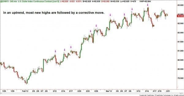 The reality is that trends are formed by saw- tooth type patterns, and not ?straight forty five degree angle lines.? These undulations tend to trap trend traders because they wait for too much confirmation. ?The likely reason this happens is because of how they are conditioned to trade trending type markets.? ?An example of how this thinking is flawed would be that when a market is trending higher it?s safer to buy when it makes a higher peak. Conversely, lots of traders are trained by many conventional trading books to sell only when the market breaks to a new low. ?As we can see in the chart below, when the market is trending higher most of the new peaks are followed by counter-trend moves otherwise known as corrections. ?And therein lies the problem when buying after the new high price has printed. That is unless you?re willing to sit through big?draw-downs waiting for the trend to resume.