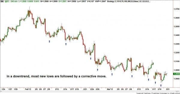 Likewise, in a downtrend, when the market breaks to new lows, an upward move ensues. ?This is illustrated in the 240 minute chart of the Euro FX contract shown below. ?Traders waiting for a break in price before shorting will also encounter the same?difficulty.