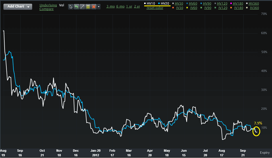 HV is currently at 7.9%; this is in the toilet low. ?In fact, when the VIX was near 14, ?HV was actually higher than it currently is now. ?The VIX is trading between 15 and 16, double the value of realized volatility.