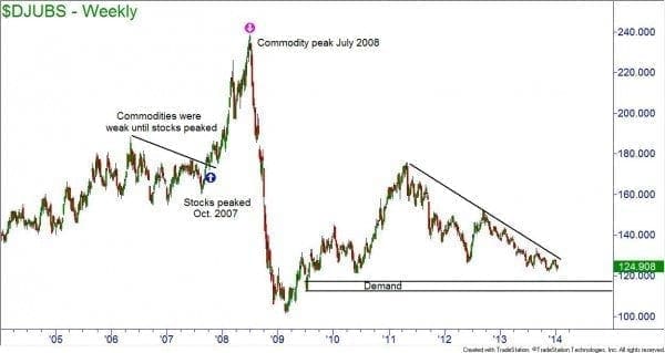 The last market to peak is the commodity market.? This peak usually occurs two to three months before the recession begins.? They remained weak until stocks started to fall in October 2007.? Then they erupted as investors looked for safety.? There is a similar pattern now as we get closer to long term demand.