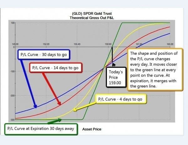 The blue curve is today?s P/L curve. As the price of GLD rises and falls during the day today, we can think of the open profit amount as a ball rolling up and down the blue line, so that it always aligns vertically with the current price of GLD on the horizontal axis. As GLD?s price rises, the profit amount rolls up the blue line. If GLD drops in price, the ball rolls down the blue line.