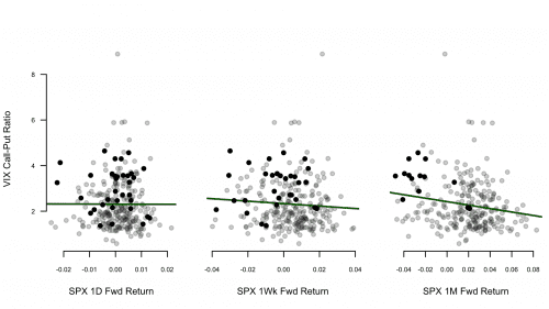 So what has recent market activity meant for future returns? The plots below show VIX call-put ratio values and S&P 500 Index returns one day, one week, and one month after a given VIX option ratio. Data is shown since the beginning of 2013, with values since Dec. 18 shown in black and regressions run against the full data set shown.