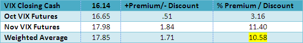The day weighting applied 10% to October and 90% to November resulting in the average premium of 1.71or 10.58% shown above. Our alternative volume weighting between October and November is a 7.51% premium. Last week the day-weighted premium was 16.62%, while the volume weighted was 15.00%. The declining premium suggests less willingness to bid up the prices, although Friday’s volume was 149,114 contracts and the open interest expanded to 419,966 contracts compared with the previous Friday’s open interest at 407,720. The last trading day for the VIX October futures is Tuesday.