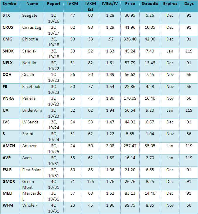 Anticipating 3Q earnings reports next month we updated our list of underlying stocks that in the past experienced significant increased options implied volatility going into their reporting dates. We are calling them our Volatility Kings and have the list of those reporting in October below.