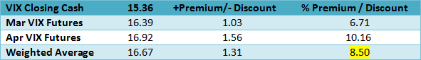 The table below shows the VIX cash compared to the next two futures contracts as well as our calculation of Larry McMillan’s day-weighted average between the first and second months.
