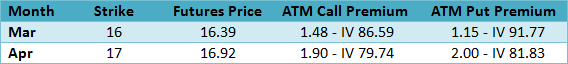 The current 30-day Historical Volatility was 134.96, up substantially since last week when it was 88.53 and 69.03. Using Parkinson’s range method, the comparable historical volatilities measures were 92.51, 60.34 last week, and 50.13 two weeks ago, all reflecting the increased movement. The table below shows the Implied Volatility (IV) of the at-the-money VIX calls and puts using the futures prices based upon Friday’s closing option mid prices along with their respective month’s futures prices, since the options are priced from the tradable futures.