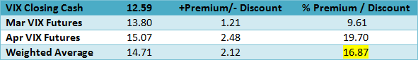 The table below shows the VIX cash compared to the next two futures contracts as well as our calculation of Larry McMillan’s day-weighted average between the first and second months.