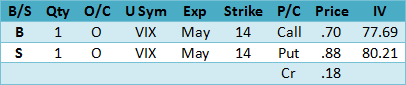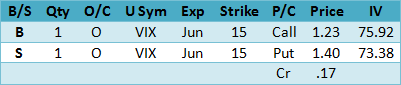 Since the May VIX Futures (VIK3) expire on the opening Wednesday May 22 they are the most responsive to changes in the VIX price. For hedging later in the week and beyond we suggest using options on June VIX Futures (VIM3) 15.08. Remember to match the strike price to the futures not the VIX index.