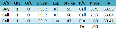 We last suggested FSLR last year when it was 20.44. In early April it broke out to the upside after an analysts meeting and has not pulled back very much since including this most recent correction thus making it one of those that declined the lest on the correction and a long candidate once again. On the presumption the smart money still owns it, although the short interest is still relatively high at 35.80% as of May 15, consider this long call combination.