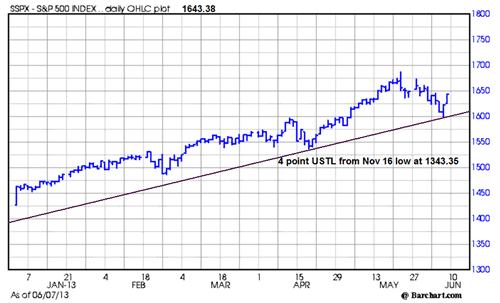 As we speculated two weeks ago, a decline to support at 1598.60 would be 5.25%, about right for correction in an upward going trend. In addition, it would then put it right on the upward sloping trendline (USTL see below), that begins from the November 16, 2012 low at 1343.35. Since it has been 202 days between the trendline low at point one on November 16 to Thursday’s low at 1593.23, we calculate the slope of the trendline to be 1.26 points per day.