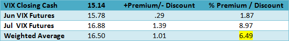 The day weighting applies 35% to June and 65% to July for an average premium of 8.95% shown above. Our alternative volume weighed average between June and July found in the Options Data Analysis section on our homepage is slightly lower at 7.68%. Both premium measures appear to be increasing again after being much lower during the week reflecting the flat term structure as the futures increased up toward the cash. For example, on Wednesday the volume weighted premium was -1.12 and averaged just .53 for the first four days of the week as SPX came down to test 1600. In the past flat term structures with low or negative premiums have signaled market turns.