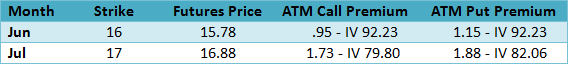 With a current 30-day Historical Volatility of 69.10 and 62.92 using Parkinson’s range method, the table below shows the Implied Volatility (IV) of the at-the-money VIX calls and puts using the futures prices based upon Friday’s closing option mid prices along with their respective month’s futures prices, since the options are priced from the tradable futures.