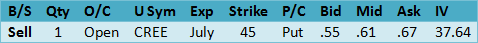 The current?Historical Volatility?is 50.89 and 37.71 using the?Parkinson’s range method, with an?Implied Volatility Index Mean?of 62.77 up from 25.99 the week before. The 52-week high was 62.77 Friday while the low was 24.47 on May 23, 2013. The implied volatility/historical volatility ratio using the range method is 1.66 so the option prices are expensive relative to movement of the stock but less relevant if more takeover bids are forthcoming. The?put-call ratio?at .11 reflects bullish call activity while Friday’s volume at 107,658 contracts traded compares to the 5-day average volume of 40,740 contracts. The bid/ask spreads seem reasonable. Here is long theta put sale idea