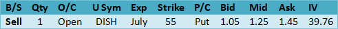 Dish Network Corp.?(DISH) although more likely to be an acquirer there was no specific news accounting for increasing implied volatility Friday. It could just be responding to other activity in the communications sector or perhaps there will be news released later this week. In the current low implied volatility environment we will take what we can find. Here is another put sale idea.