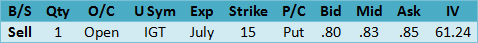 The current?Historical Volatility?is 22.91 and 25.55 using the?Parkinson’s range method, with an?Implied Volatility Index Mean?of 34.07 up from 29.63 the week before. The 52-week high was 63.05 on October 13, 2013 while the low was 29.33 on June 10, 2014. The implied volatility/historical volatility ratio using the range method is 1.33 so the option prices are slightly expensive relative to movement of the stock. The?put-call ratio?at .10 reflects bullish call activity while Friday’s volume at 47,947 contracts traded compares to the 5-day average volume of 14,100 contracts. Here is another long theta put sale idea.
