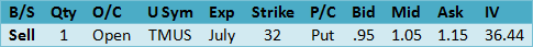 T-Mobile US, Inc.?(TMUS) 32.91 as a follow-on to the put sale suggested in?Digest Issue 22 “Liquidity & Dividends”?here is another along with updated options data.