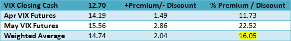 The table below shows the VIX cash compared to the next two futures contracts as well as our calculation of Larry McMillan’s day-weighted average between the first and second months.