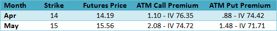 With a current 30-day Historical Volatility of 148.64 and 106.49 using Parkinson’s range method, the table below shows the Implied Volatility (IV) of the at-the-money VIX calls and puts using the futures prices based upon Friday’s closing option mid prices along with their respective month’s futures prices, since the options are priced from the tradable futures.