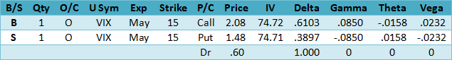 Based on the May VIX Futures price of 15.56 the at-the-money VIX options are the May 15 calls and puts.