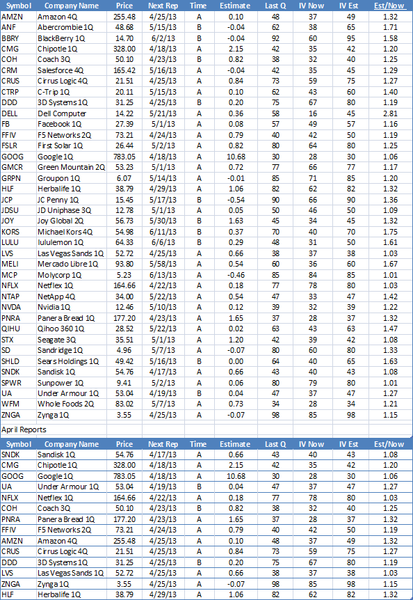 Est/Now is the ratio of the estimated implied volatility to the current implied volatility. Those with higher ratios have a potentially greater opportunity to increase going into their report date. Since the market implied volatility as measured by the VIX is lower than in previous periods, many of the ratios are also lower this quarter. By this measure PNRA, AMZN, and HLF have the most April potential.