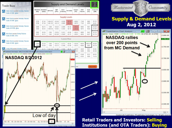 Point number three above has four key words in it that you must understand: ?before everyone else does.? Let?s take a look at a trading opportunity recently identified in the Mastermind Community that used the combination of a large time frame opportunity and small time frame execution to limit risk and maximize reward. August 2nd on the Mastermind Community supply / demand grid, I identified a demand level (buying opportunity) for our students in the NASDAQ Futures at the 2600 level.
