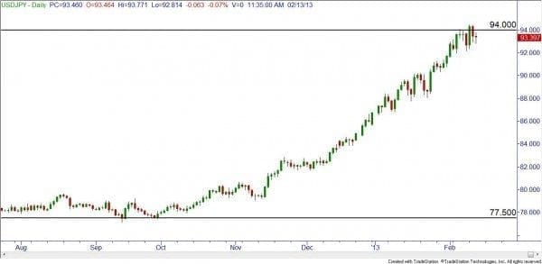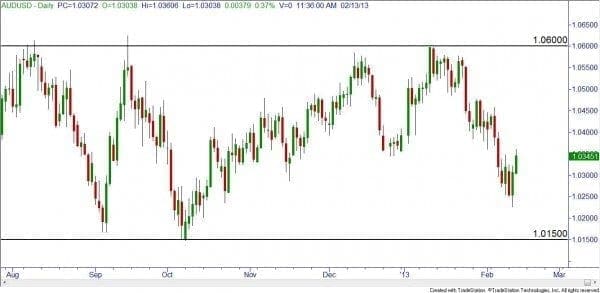 In the following charts, you can easily see which central bank is ?winning? the race to create a weaker currency ? a dirtier shirt than the others, if you will. When considering the AUDUSD pair, it has been stuck in a trading range of approximately 450 pips since last August ? ?with a daily Average True Range (ATR) of a paltry 73 pips at the time of this writing. Both shirts look to be equally dirty, not the best trending pair to trade!